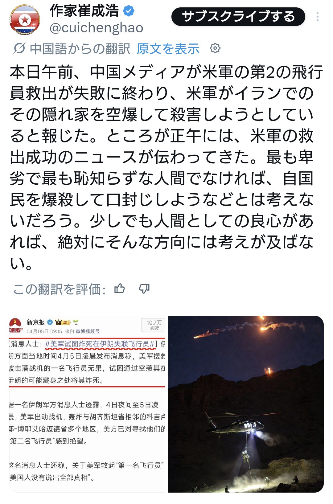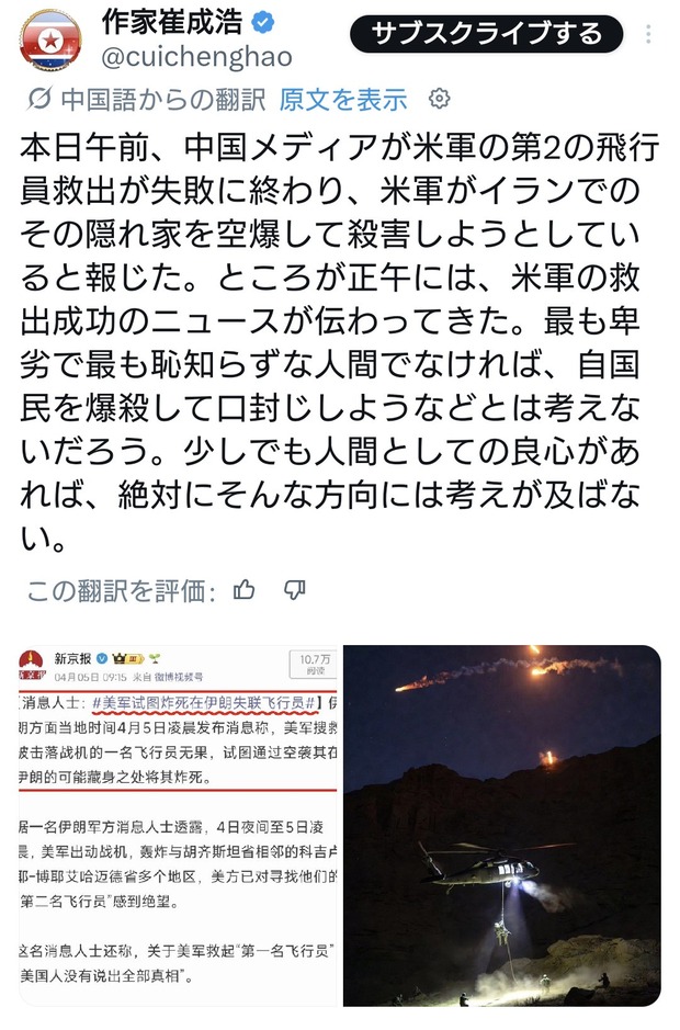 1:2026/04/05(日) 20:32:40.87 ID:MDUvQK5x0 今天上午,有中国媒体竟称,美军搜救第二名飞行员无果,欲空袭其在伊朗可能的藏身之处将其炸死。结果中午就传来美军营救成功的消息。只有最卑鄙最无耻的人,才会想到把自己人炸死以灭口,但凡有一丝一毫做人的良心,都绝不会往那方面想。 pic.twitter.com/GM7IeGs3Tv — 作家崔成浩 (@cuichenghao) April 5, 2026