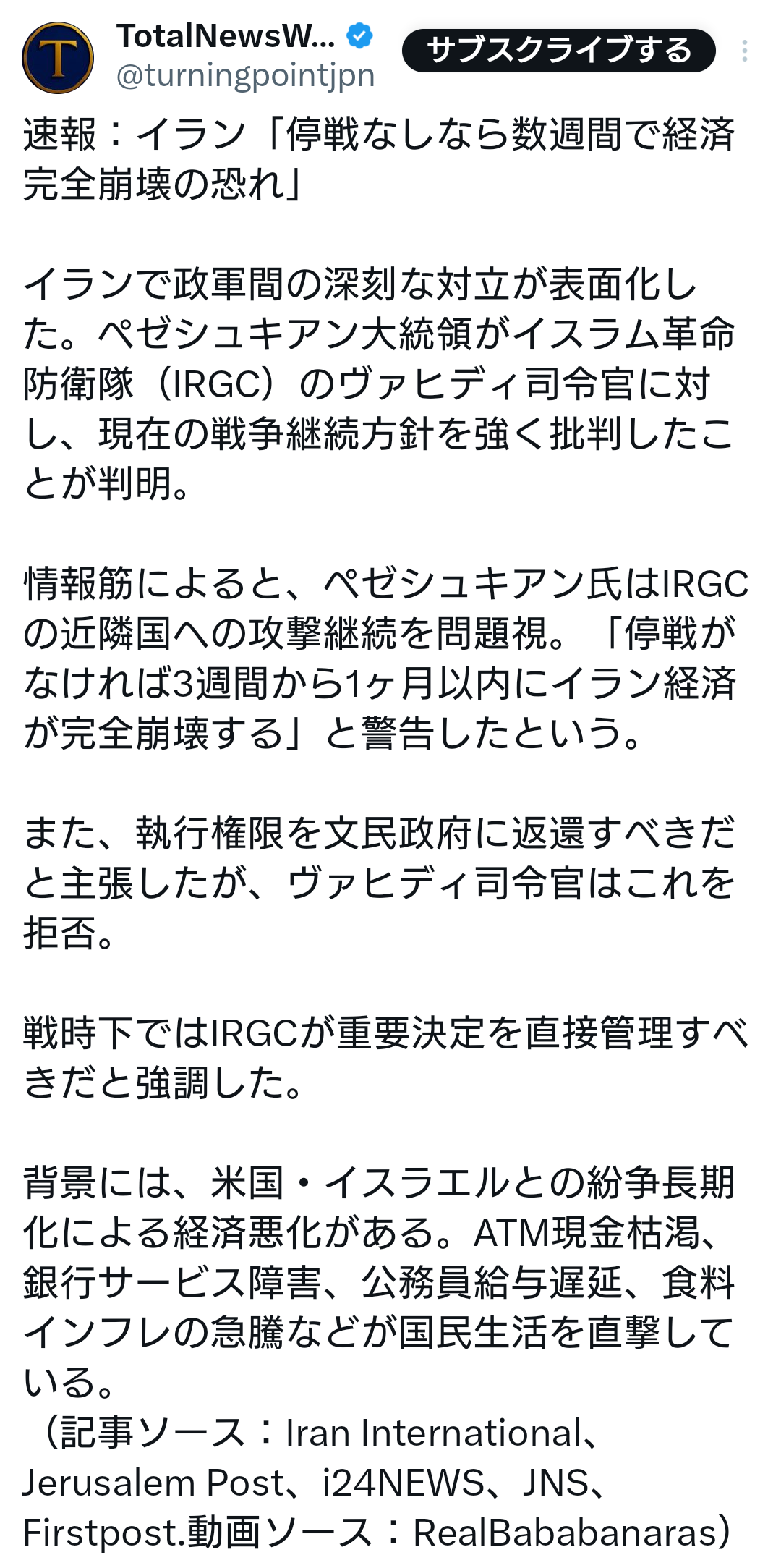1:2026/04/06(月) 20:26:31.83 ID:jiUaX4LA0 速報:イラン「停戦なしなら数週間で経済完全崩壊の恐れ」 イランで政軍間の深刻な対立が表面化した。ペゼシュキアン大統領がイスラム革命防衛隊(IRGC)のヴァヒディ司令官に対し、現在の戦争継続方針を強く批判したことが判明。… pic.twitter.com/M3tFuFBhTo — TotalNewsWorld (@turningpointjpn) April 6, 2026