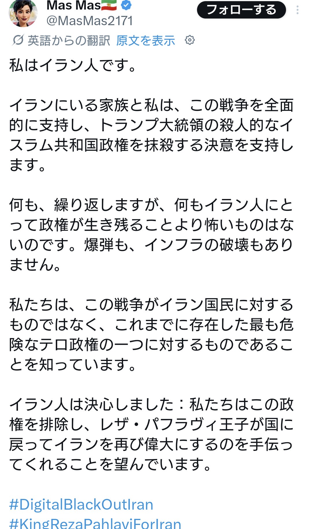 1:2026/04/07(火) 23:12:00.10 ID:e3bH6OO40 I’m Iranian. My family in Iran and I fully support this war and endorse President Trump’s resolve to obliterate the murderous Islamic Republic regime. Nothing, I repeat, NOTHING is scarier for Iranians than the regime surviving—not bombs and not the destruction of any… pic.twitter.com/xKl0JMthKJ — Mas Mas🇮🇷 (@MasMas2171) April 6, 2026