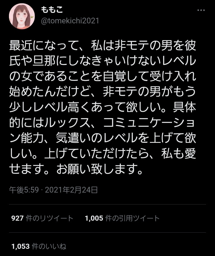 1 : 以下、?ちゃんねるからVIPがお送りします :2026/04/07(火) 05:53:43.940 ID:7ACrFDEv0.net 最近になって、私は非モテの男を彼氏や旦那にしなきゃいけないレベルの女であることを自覚して受け入れ始めたんだけど、非モテの男がもう少しレベル高くあって欲しい。具体的にはルックス、コミュニケーション能力、気遣いのレベルを上げて欲しい。上げていただけたら、私も愛せます。お願い致します。 — ももこ (@tomekichi2021) February 24, 2021