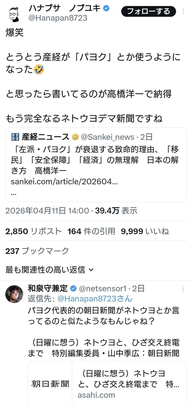 1:2026/04/13(月) 20:38:18.36 ID:alHKIhoU0 産経ニュースの記事で『パヨク』という表現が使われたことを笑っていらっしゃいますが、朝日新聞では以前から『ネトウヨ』という言葉を記事タイトルや本文で普通に使用しています。 — パニッシャー (@punisher007) April 12, 2026