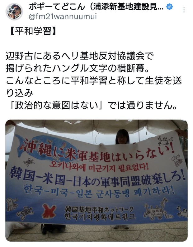 1:2026/04/14(火) 08:11:20.71 ID:7MFGg7180 【平和学習】 辺野古にあるヘリ基地反対協議会で — ボギーてどこん(浦添新基地建設見直し協議会) (@fm21wannuumui) April 12, 2026