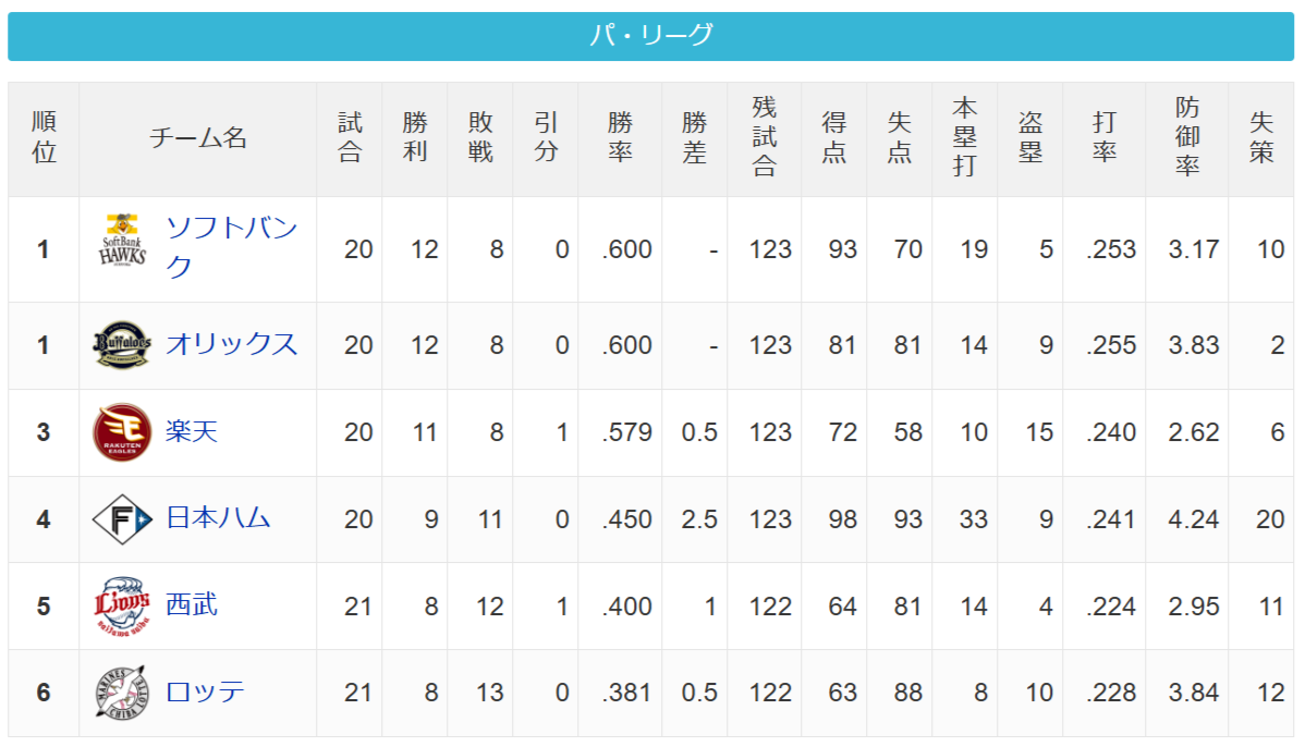【朗報】今年のパ・リーグ、どこが優勝してもおかしくない大混戦 投稿日 2026年4月21日 01:30:11 (スポーツ) 1: 名無しさん 2026/04/20(月) 15:29:06.35 ID:SE27Rudu0 すごい 続きを読む Source: 日刊やきう速報 続きを読む>> 最新情報 中日次期監督候補に嶋ヘッドコーチが浮上 【朗報】中日ドラゴンズ、19試合中12試合で先制点をあげていたことが判明 【朗報】村上宗隆さん、現地ホワイトソックスファンから感謝される 明日の巨人vs中日戦 in長野 勝敗予想 佐藤輝明 「打率.384(73-28) 5本 19打点 OPS1.207 」←こいつについての率直な感想wwwwwww タコライス(タコは入っていない)←こういうやつ 日本ハムファイターズチーム防御率4.24(12球団ワーストタイ) 中日井上監督(4勝15敗.211)「一方的にやられた試合は1つもない。どこが相手でも五分の戦いはできてる ドジャース逆転負け今季初連敗 佐々木朗希はリード守れず5回途中3失点KO 【悲報】4月の広島東洋カープさん、3勝10敗 落合「アメリカは中4日5日で球数制限というのはあるだろうけど、日本の場合中6日ですよ。120投げて中6日空けるんだったら、先発してそんなに苦労はしないと思う」 村上宗隆 打率.209 本塁打7 打点14 OPS.908 中日4連敗で借金は今季最多「11」 土日ゲームは8戦全敗 高橋宏斗6回途中6失点KO 【悲報】NPB、遊撃手不足に直面する 金本の現在wwwwwwwwww SB上沢 1.27 2勝0敗 28.1回 被打率.176 WHIP0.88 中日井上監督「たしかに最下位(4勝14敗)だが『10-0』みたいな大敗は1回もやってないよ」 阪神OBの関本賢太郎氏が当面の活動を自粛 SNSで発表 1番「そういえばそんなのあったな」ってもの挙げたやつ優勝 【朗報】村上宗隆さん、チーム最強打者として堂々君臨 中日ドラゴンズ 6位 4勝14敗 勝率.222 【悲報】今井達也さん、ブチギレ 【悲報】杉浦稔大さん(中日)、リリーフ登板してあいさつ代わりの失点 大野の勝ちを消す 【悲報】愛知県民、意外と味噌カツとひつまぶしを食べない 病気の子供「明日の試合でホームラン打ったら僕手術するよ!」←これで打ちそうな選手 久しぶりに食うと気絶するほど美味い食い物wwww 【朗報】桑原将志、ライオンズファンから救世主扱いを受ける MLB「残りの人生で調味料を1種類しか使えないとしたら、何を選ぶ?」大谷「マヨ」 千賀滉大、2登板連続7失点3敗目 四球から被弾失点の悪循環 防御率8.83 先発ローテ落ち危機 メッツ22年ぶり泥沼9連敗 岡本、村上の不調の原因って何? 【画像】やけんモテんさん、セクシーグラビア→♡♡♡ 【画像】19歳女が入浴中の写真をストーリーに上げてるんやが反射してる⇒wwwww