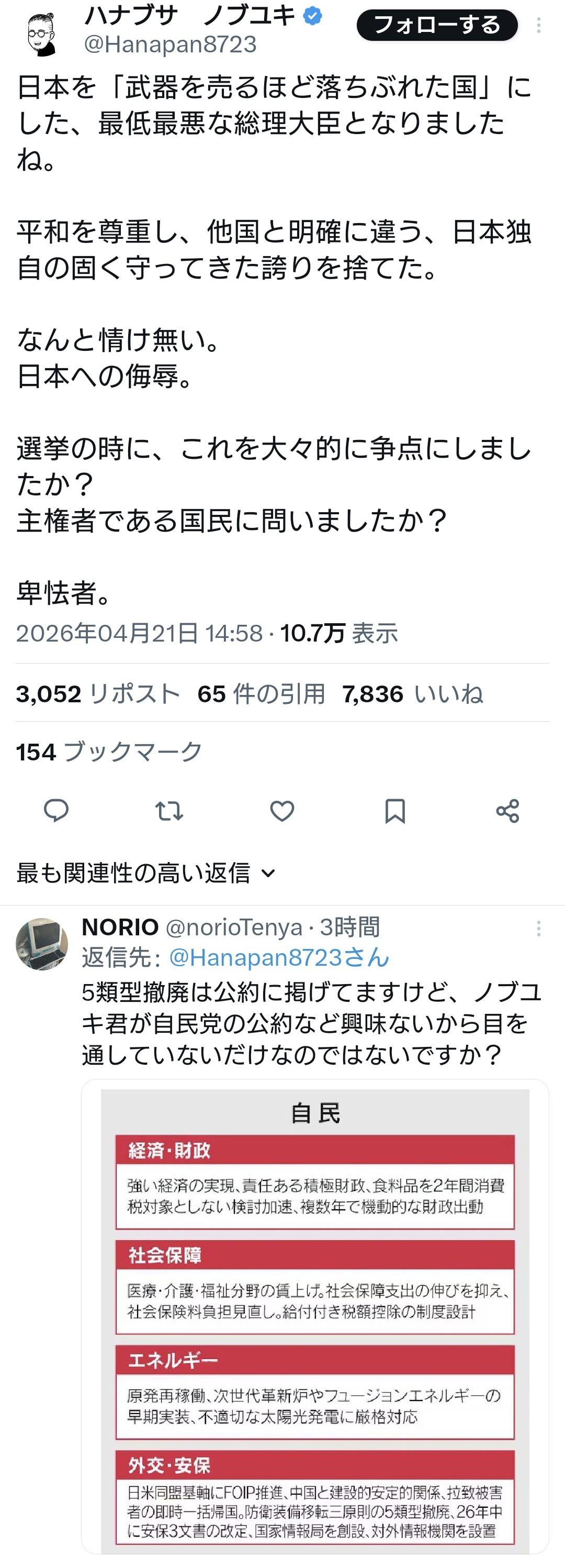 1:2026/04/21(火) 21:08:58.83 ID:Z4ew3t090 最初から選挙公約に入ってたけど?あなたが見落としてただけでは? https://t.co/Gsv9nmwYbi pic.twitter.com/uRVpmSlXKO — 和泉守兼定 (@netsensor1) April 21, 2026