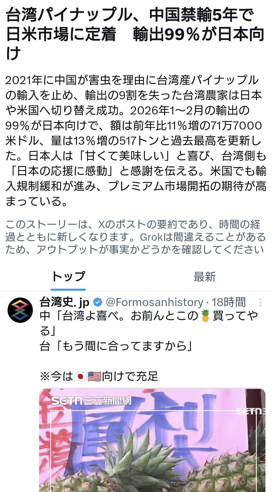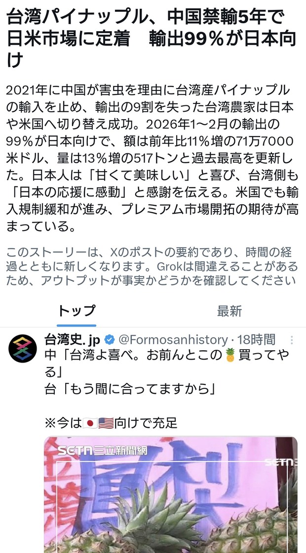 台湾パイナップル、中国禁輸5年で日米市場に定着 輸出99%が日本向け / X